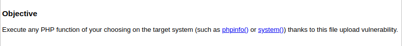 파일 업로드 취약점을 이용해서 대상 시스템에서 선택한 PHP 기능(예: phpinfo() 또는 system())을 실행해라!