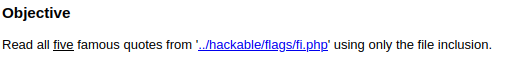해석해보면 ../hackable/flags/fi.php에 있는 5개의 인용문 모두를 오직 file inclusion으로만 읽는 것이 목표이다.
