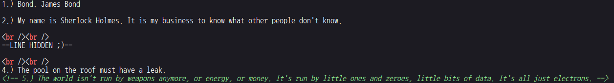 echo "2.) My name is Sherlock Holmes. It is my business to know what other people don't know.\n\n<br /><br />\n";