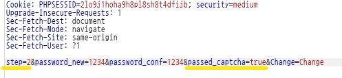 위 코드를 보면 알 수 있듯이 hide_form이 true여야한다. 더 내려가 코드를 봤을 때 step1에서 step2로 변경하는 것을 방지하기 위함을 알 수 있었다. 그러면 hide_form을 true임으로 인식하기위해 버프슈트를 이용하여 passed_captcha=true라는 문구를 이용하여 보내보자.
