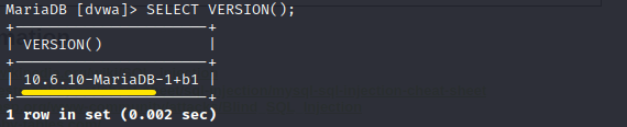 위 그림과 같이 현재 db의 이름은 dvwa임을 알 수 있었다. 그러면 dvwa에 들어가 버전을 확인해보자.